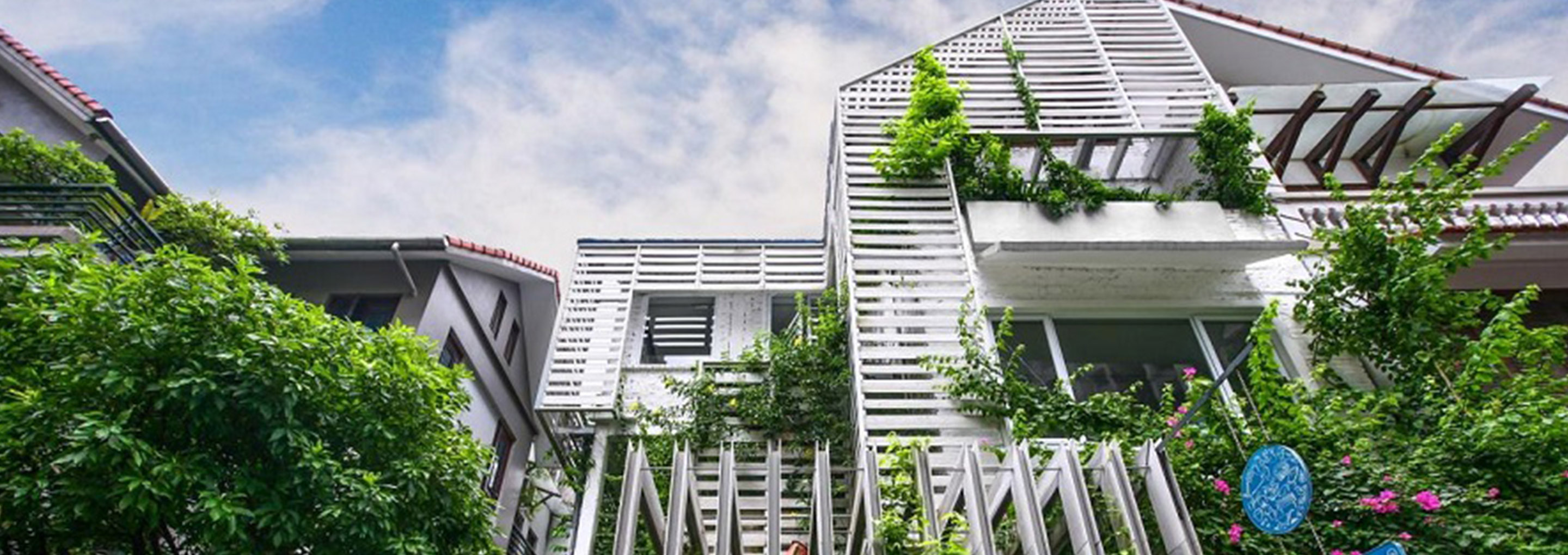 Đáp ứng được đầy đủ yêu cầu về độ bền thời tiết nắng mưa, nước khi cây xanh bám vào, yêu cầu về tính thẩm mỹ để tạo thành không gian sáng tạo cho một văn phòng thiết kế, sản phẩm tấm vân gỗ DURAwood được Kiến Trúc Sư lựa chọn để làm hệ nan để cây xanh bám vào.